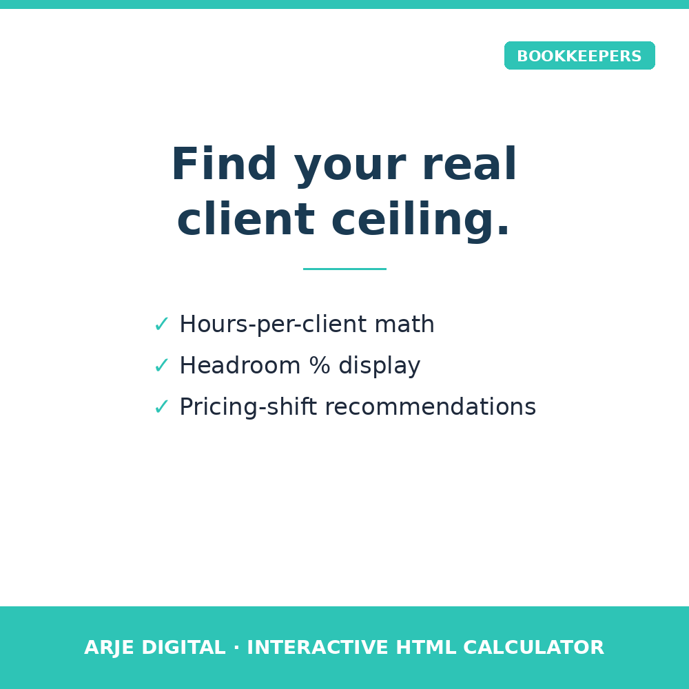 Find your real client ceiling in 60 seconds. Models hours per client, hours per week, and target revenue to expose the capacity wall most bookkeepers hit at 12-15 clients.